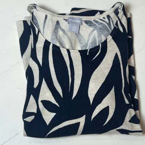 Chico's women's lightweight knit top featuring a navy and beige abstract leaf print. Made from a sof... Show more