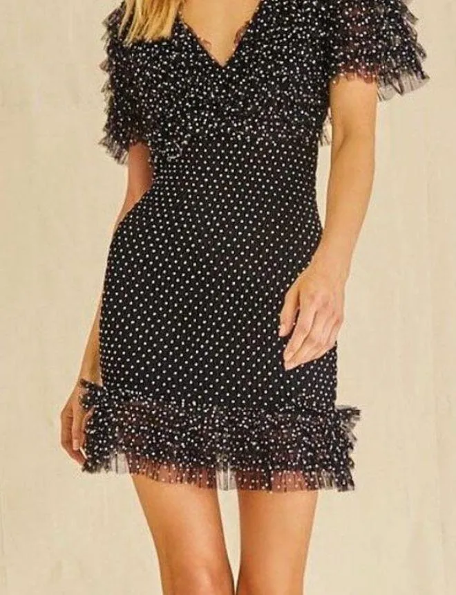 Chic mini dress with playful polka dots. Features ruffle accents and a flattering silhouette. Ideal... Show more