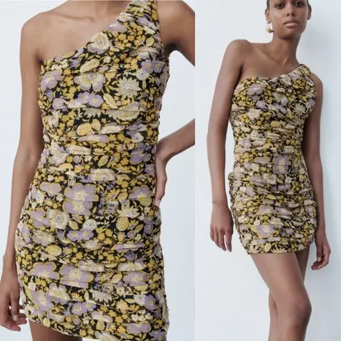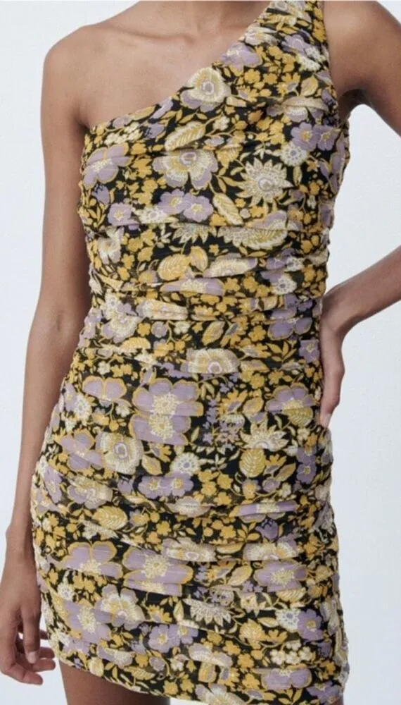 NWT Zara One Shoulder Floral Ruched Metallic Mini Dress BodyCon Small Party Club •Size- Small •Ma... Show more