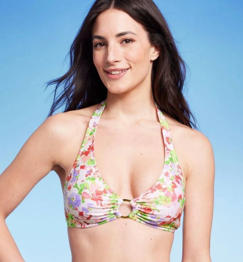 Fit & style ^ • Halter bralette bikini top with center front ring • Multi-floral print • Back with h... Show more