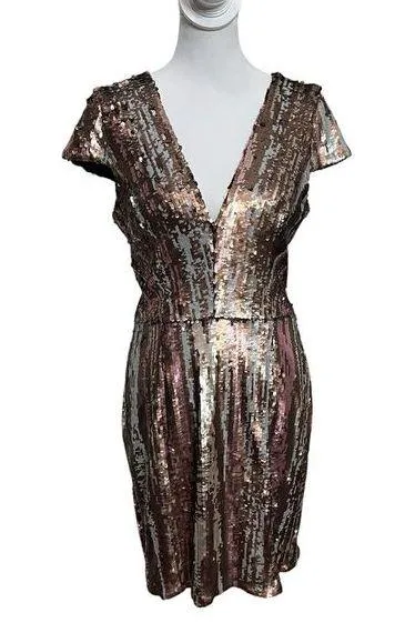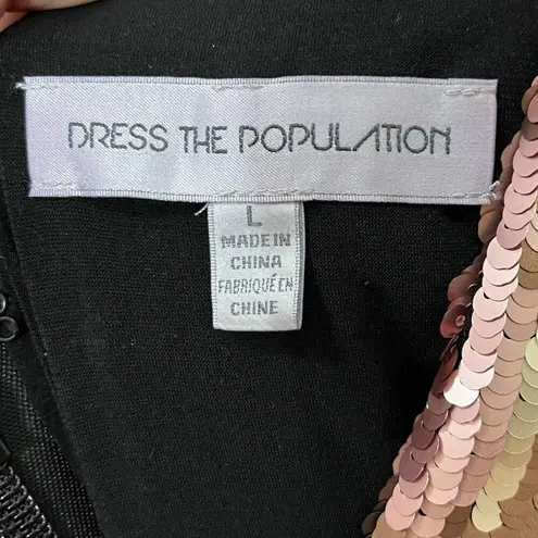 Dress the Population Zoe Cap Sleeve Sequin Sheath Mini Dress Womens Size L * Sequin mini dress with cap sleeves and a plunging neckline. * Plunging V-neck. * Cap sleeves. * Back zip closure. * High quality fabric using specialty stitch to secure sequins. * Lined. * Polyester/spandex. * Machine wash. * Imported Approximate Measurements taken flat:pit to pit 17, waist 14.5, length 36 Pre-owned; in excellent condition. No rips, stains or holes. Please see all photos for condition details.