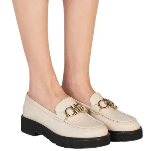 Brand: Salvatore Ferragamo Size: 8.5C (standard width)/ US size 8.5 Condition: Pre-owned - Some marks underneath the gancini logo. Excellent condition otherwise. Material: 100% Calf Leather Detail: Neutral light cream beige color Round toe Gold Gancini logo upper Slip on loafer/ mocassins Chunky lug sole Made in Italy MSRP $895 Comes with dust bag Guarantee authentic Measurement: Heel: 0.78"