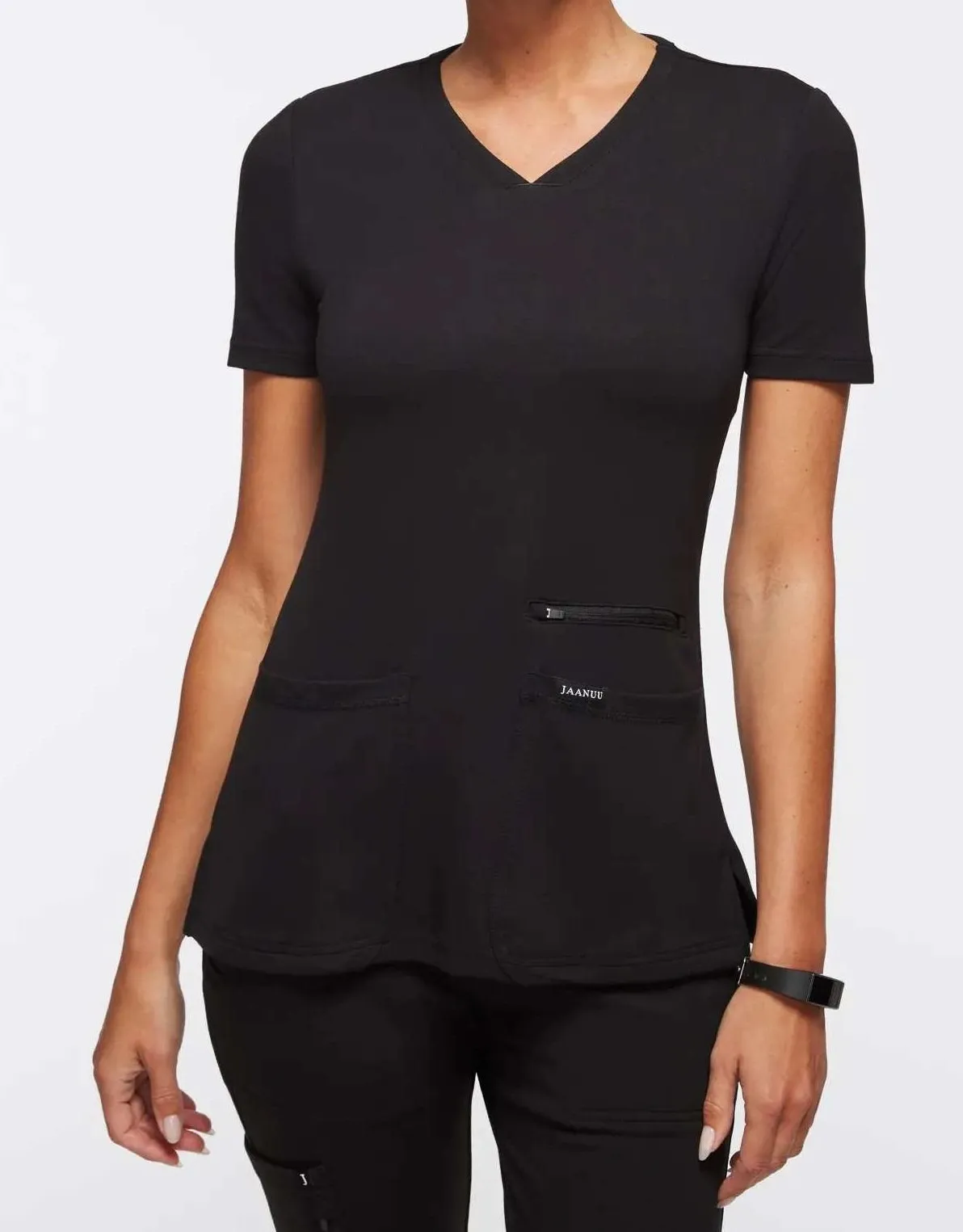 JAANUU women's black V-neck scrub top in size 1X. NWT NEW WITH TAGS *any flaws will be noted above* ***Please make reasonable offers with the "offer" button (I won't negotiate in comments, no transactions offsite, no trades)**** • All items come from a smoke-free home. • Please compare the measurements to something you already own. Keywords: scrub top, medical uniform, healthcare apparel, workwear, vneck, short sleeve, black scrub, plus size scrub, functional pockets, zipper pocket, nurse attire, veterinarian, dental assistant