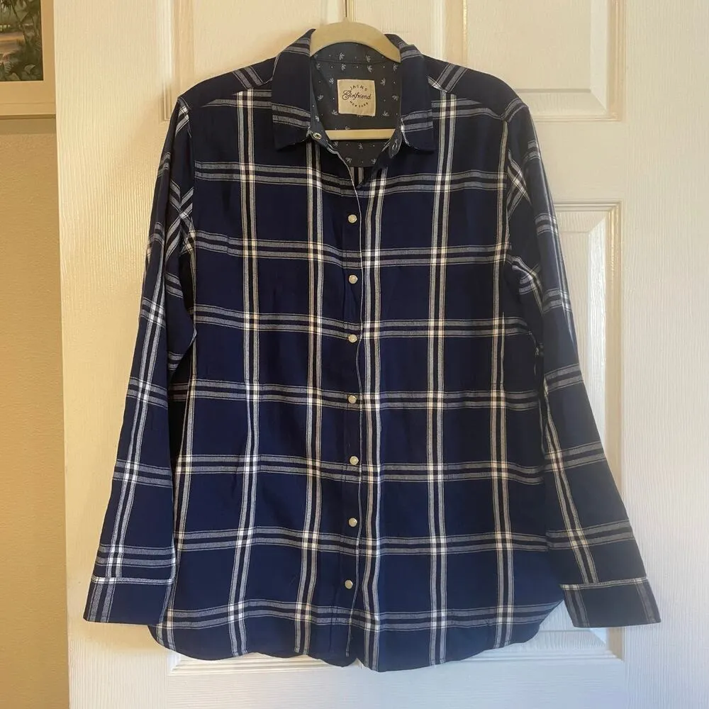 Jachs Girlfriend Ladies L shirt Womens Cozy Flannel snap up blue plaid size Large. Super Soft Fabric: Crafted from a blend of 65% Rayon and 35% Polyester, this flannel shirt offers an exceptionally soft feel against the skin for all-day comfort. Classic Button Front Closure: The button front design allows for easy wear and versatile styling, making it suitable for various occasions. Stylish Shirttail Hem: The shirttail hem adds a modern twist to the traditional flannel shirt silhouette, enhancing its overall style. Relaxed Fit Design: The relaxed fit ensures comfort and freedom of movement, making it perfect for layering or wearing on its own.