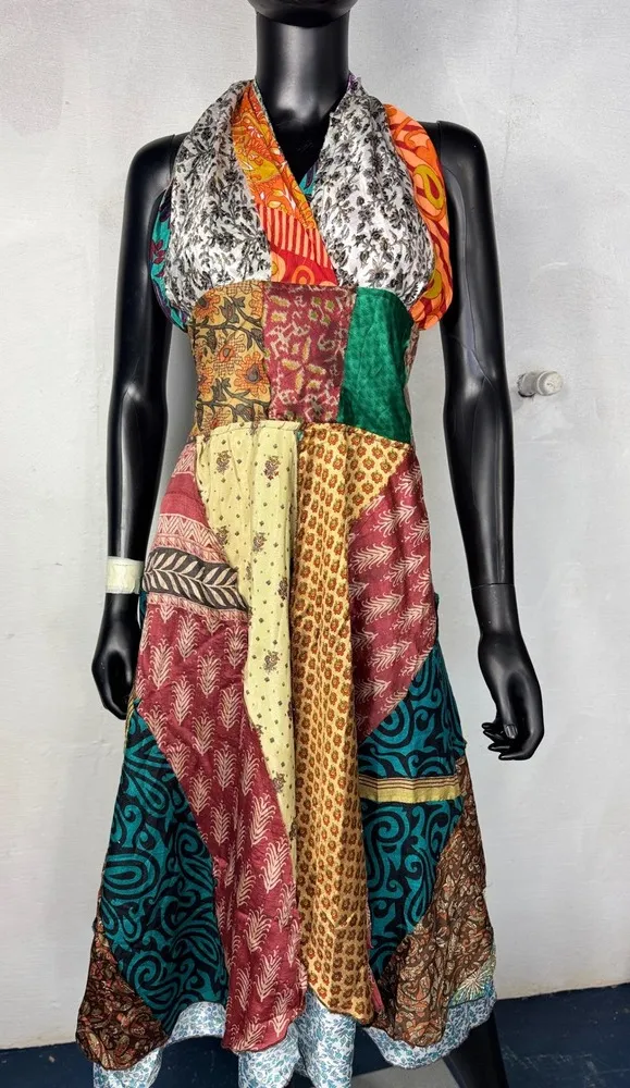 Dare to make a vibrant statement in this captivating patchwork dress. An explosion of color and pattern, this dress features a unique halter neckline that accentuates the shoulders and back. The bodice is a tapestry of silk, with carefully pieced together patches creating an eye-catching mosaic. The flowing skirt adds movement and grace, ensuring a comfortable and flattering fit. A truly one-of-a-kind piece, this dress is ideal for expressing your individual style at music festivals, bohemian gatherings, or any occasion where you want to stand out from the crowd. Measurements: • Length (from top of bodice): Approximately 46 inches • Waist: Approximately 28-30 inches (elasticized) Keywords: patchwork dress, silk dress, halter dress, boho dress, hippie dress, festival dress, colorful dress, unique dress, handmade dress, vintage dress, midi dress, bohemian dress, recycled silk, upcycled silk