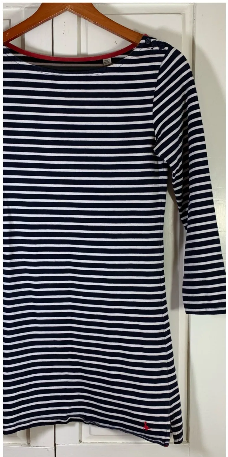 Significant wash wear - no holes or stains - bottom hem rolls. Jack Wills University Outfitters striped tunic top. This classic navy and white striped top features a flattering boat neckline with a red trim detail. Three decorative navy buttons with an anchor motif accent the left shoulder. A small embroidered red bird logo adorns the hem. Perfect for a casual day out, a weekend getaway, or a nautical-themed event. Type: T-Shirt Department: Women Style: Tunic Material: Cotton Blend Neckline: Boat Neck Sleeve Length: 3/4 Sleeve Sleeve Type: Classic/Fitted Sleeve Pattern: Striped Accents: Embroidered, Button Theme: University, Bird Features: Contrasting Trim Character: Bird Fit: Regular Fabric Type: Jersey Occasion: Casual Keywords: Jack Wills, striped top, boat neck, tunic, nautical, preppy, casual wear, three quarter sleeve, crew neck, everyday, basic, classic, college style