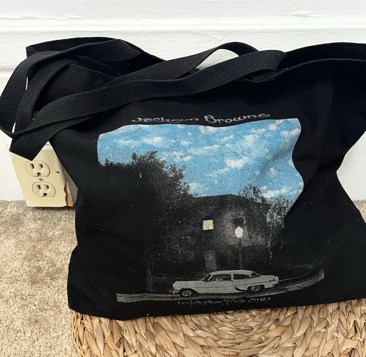 Black cotton tote bag Super roomy Features the album cover artwork from "Late for the Sky" on the cover in a sky blue with the moon above and a vintage car in the front Measures 17 x 15 inches