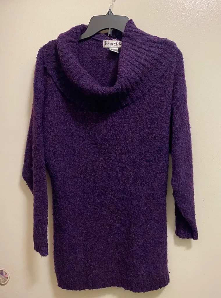 Stay cozy and stylish with this elegant purple cowl neck sweater. Perfect for any occasion. Excelle... Show more