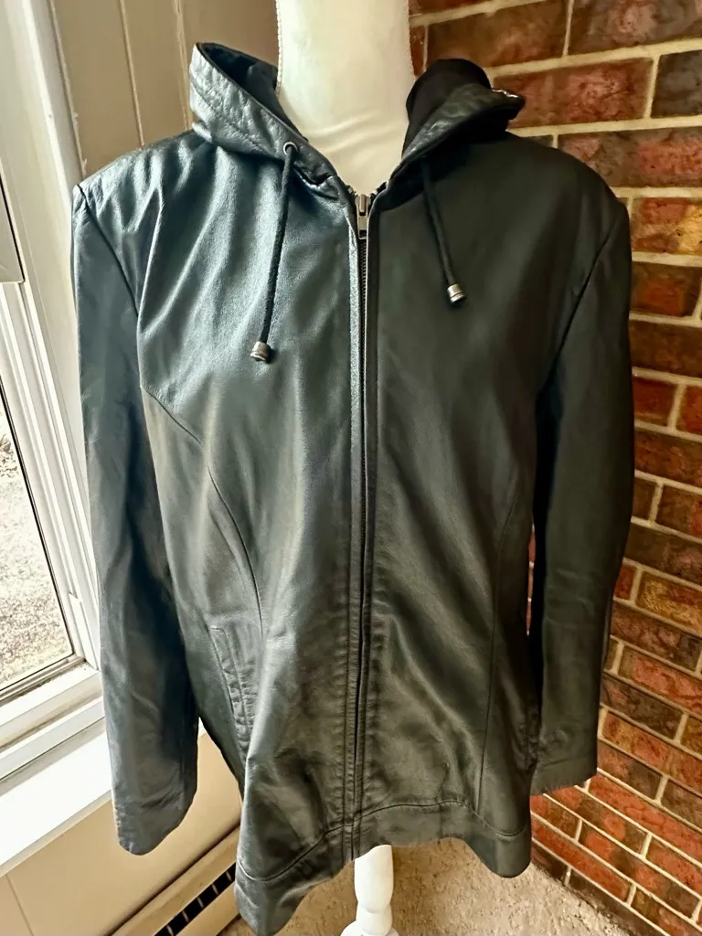 Chic black leather jacket with a hood. Stylish and versatile for any wardrobe. Please note: there is no size label in the jacket so please see measurements for fit. Sleeve 24 1/2 inches Pit to pit 24 inches Shoulder to hem 26 3/4 inches