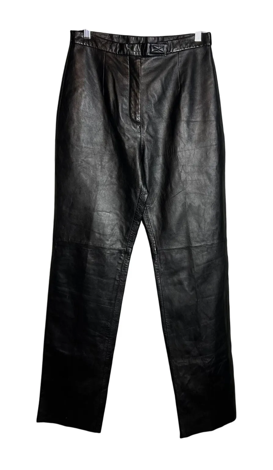 Command attention in these sleek, genuine leather pants. The high-waisted design flatters the figure, while the straight leg cut offers a timeless silhouette. A unique belt detail adds a touch of sophistication, making these pants a standout piece. The smooth lining ensures a comfortable fit, allowing you to move with ease and confidence. These pants are perfect for a night out, a business-casual event, or adding an edgy touch to your everyday style. Flatlay Measurements: waist 14" rise 12" inseam 32.5" Style: Dress Pants Color: Black Department: Women Type: Pants Material: Leather Leg Style: Straight Features: High Waist, Belted, Lined Fabric Type: Leather Closure: Hook & Loop, Zip Pattern: Solid Accents: Buckle, raw hem Occasion: Business, Casual, Party/Cocktail Keywords: Jacqueline Ferrar, Leather pants, Black pants, Size 10, High waist, Straight leg, JCPenney, Genuine leather, Vintage, Retro, Classic, Dress pants, New with tags, Evening, Going Out, Classic, Rock