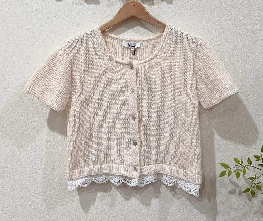 This charming short-sleeved cardigan in a lovely cream is perfect for a chic and feminine look. It features a classic round neck and a button-front closure with star shaped mother of pearl buttons. The most distinctive detail is the delicate white lace trim along the bottom hem, adding a touch of elegance and vintage flair. The knit has a nice ribbed texture, comfort and quality. It would be a versatile piece for layering! Content + Care - Hand Wash Cold - NWT preproduction item no care tag Please note: Model photo might be generated by AI, and it's for reference only, please refer to actual item for details. We do our best to ensure that our photograph products are as true to colour and condition as possible, but variations may occur due to the nature of the products we sell. Sizes of items listed in descriptions are approximate and are measured as the overall width laying down flat.