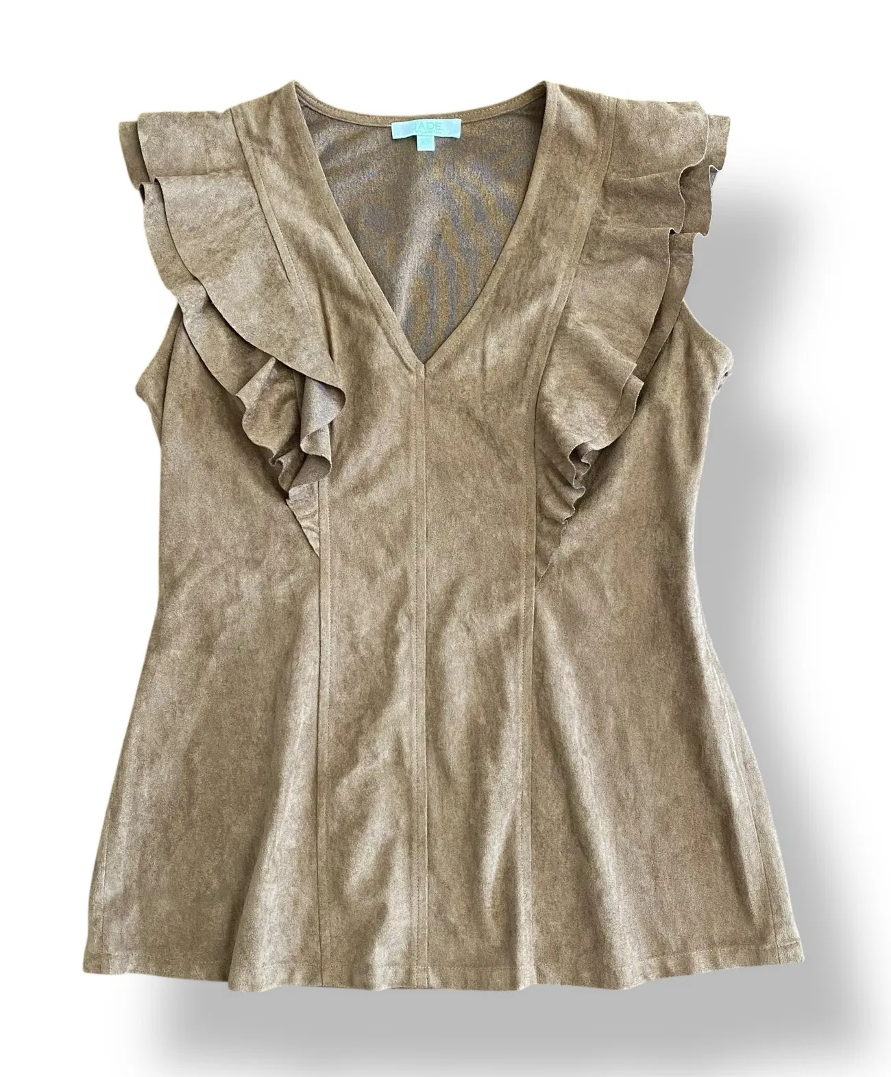 Jade by Melody Tam sleeveless top, size XS. Faux suede finish in camel tan with feminine ruffle cap... Show more
