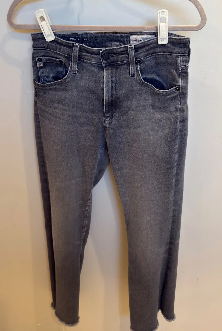 Please note the small bleach spot on the leg. AG Jeans Farrah Boot Crop jeans, a stylish and versatile addition to your denim collection. These jeans feature a flattering boot crop silhouette, perfect for pairing with your favorite boots or heels. The gray wash denim offers a modern, edgy look, while the frayed hem adds a touch of casual cool. Style: Bootcut Color: Gray Department: Women Type: Jeans Fabric Wash: Medium Accents: Fringe Features: Crop, Stretch, Pockets, Comfort, Frayed Hem Pattern: Solid Fabric Type: Denim Inseam: 26 in Material: Cotton, Polyester, Spandex, Lyocell Waist Size: 29 in Closure: Zip, Button Keywords: AG Jeans, Farrah Boot Crop, Gray Wash, Denim Jeans, Frayed Hem, Women's Jeans, Bootcut Jeans, Cropped Jeans, Casual Jeans, Designer Jeans, Size 29, AG, Jeans, Boot Crop
