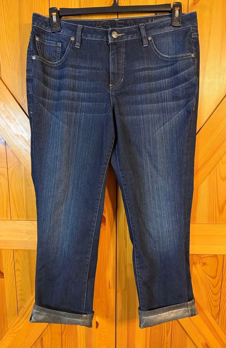 JAG Jeans Women’s Skinny Boyfriend Cuffed Distressed Dark Wash Cropped Jeans. Part of the inside pant at the hem is waxed where cuffed. Stretch. Size 14 (6511)Measurements: Waist 36” Inseam 26” Rise 10”