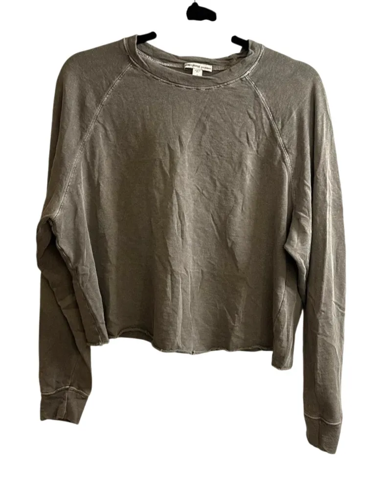 James Perse Sweatshirt Womens 1 (S) Gray Vintage French Terry Cropped Raglan James Perse Vintage French Terry Sweatshirt in Gray with pullover crew neck, raglan sleeves, and distinctive raw hem finish. Made in USA from 100% Supima Cotton French Terry with stone-washed treatment for a soft, lived-in feel. Features ribbed cuffs and neckline with a relaxed cropped silhouette. Condition: Good pre-owned condition, cropped hem Armpit to Armpit: 23" Shoulder to Hem: 20" Sleeve Length: 24"