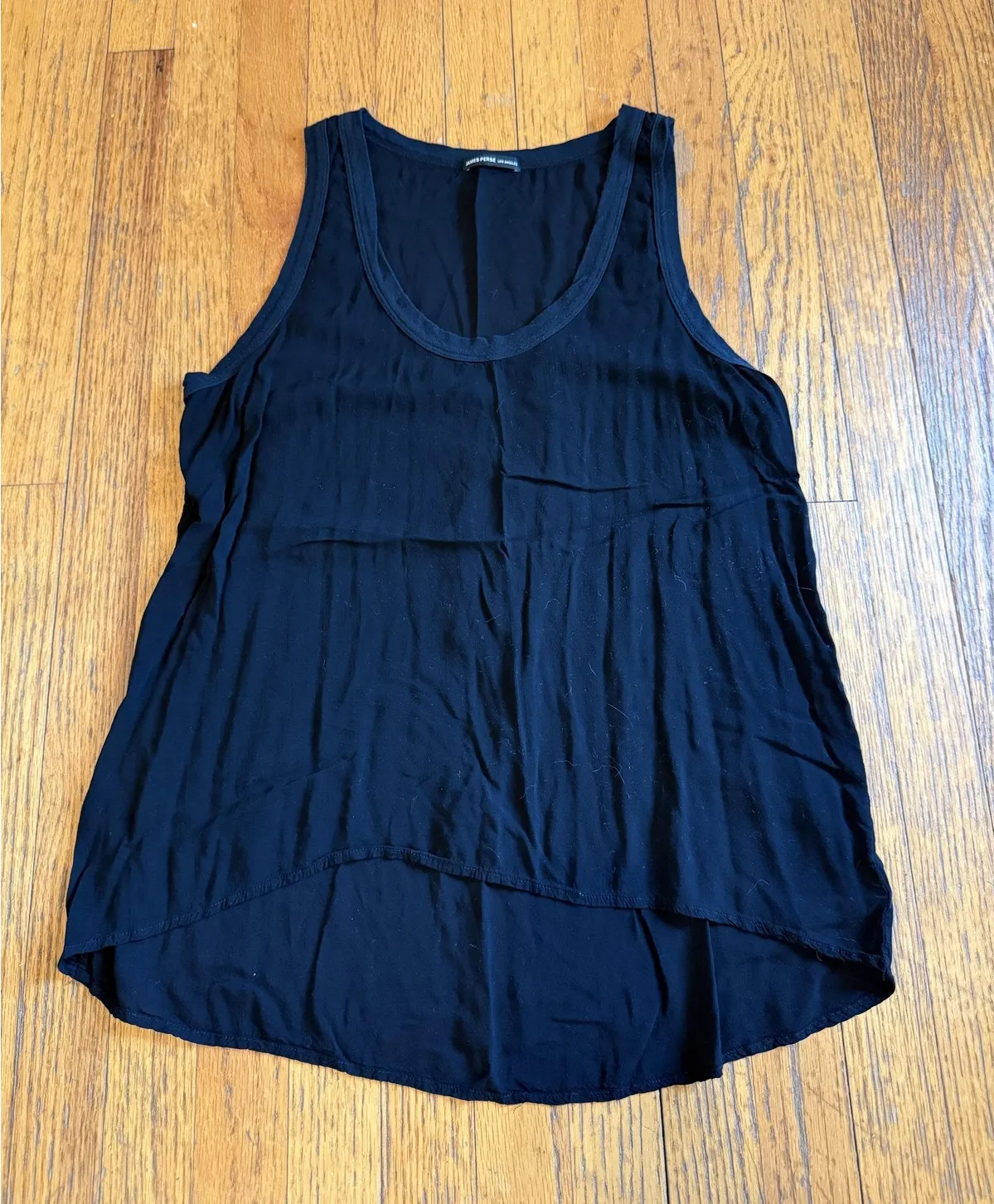 Brand: James Perse Los Angeles Item: Womens tank top / sleeveless shirt Color: Black Tag size: 4 (James Perse sizing), chest measures 18” laying flat. Length is 27” Style/Model#: WRTG394 Country of origin: Made in China Design features: Scoop neck; high-low hem; lightweight, drapey fabric; unlined Labels/markings: "JAMES PERSE LOS ANGELES" neck label; interior size/style tag present Notes: Sizing can vary by brand—consider comparing to a similar top for best fit.