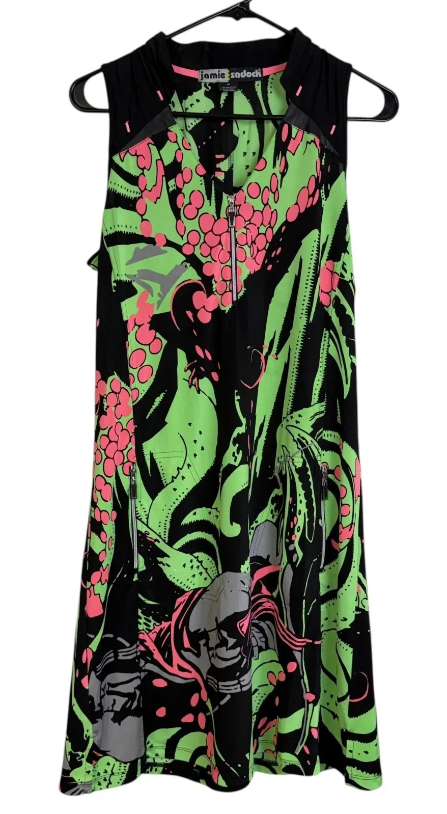 This listing is for a Jamie Sadock Women's Tentacle Print Graphic Sleeveless Golf/Tennis Dress. 1/4 Zip. Signed at the lower front. Poly blend. Condition, Good pre-owned condition / a few light grey marks at the front and a whitish mark as well (haven't tried getting it out) - see photos / small horizontal pull at the back Approx Measurements Tag Size, Medium Pit to pit, 19in Length, 36.5in