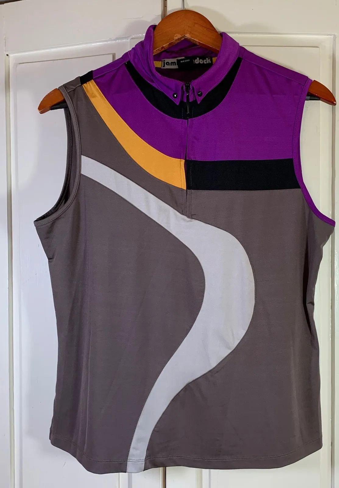 Stylish sleeveless athletic top by Jamie Sadock, perfect for a round of golf or any active pursuit. Features a unique color-blocked design in shades of purple, gray, black, and gold with a distinctive curving white accent. The top has a mock neck with a partial zip closure adorned with snap closures. A functional and fashionable piece, this top is a comfortable and breathable choice for warmer days on the course, casual outings, or a stylish addition to your athleisure wardrobe. Color: Purple Type: Tank Department: Women Performance/Activity: Golf Sleeve Length: Sleeveless Closure: Zip Character: Ivy, Cole, Warrior, Trixie, Skids Features: Stretch, Quick Dry, Lightweight, Half Zipper, Moisture Wicking Pattern: Colorblock Neckline: Mock Neck Keywords: Jamie Sadock, golf top, sleeveless top, athletic top, womens top, purple top, gray top, color block, zip up, mock neck, golf apparel, activewear, size L