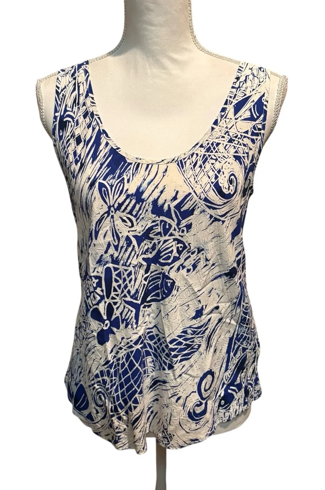 • Brand: Jams World • Print: Palani • Size: Medium • Style: Sleeveless Scoop Neck Tank Top • Color: Blue & White • Material: 100% Rayon (signature crinkle texture) • Pattern: Tropical / Fish / Floral Abstract • Condition: Excellent preowned condition — no visible flaws or stains Measurements (approx.): • Chest (pit to pit): 19" • Length: 25"