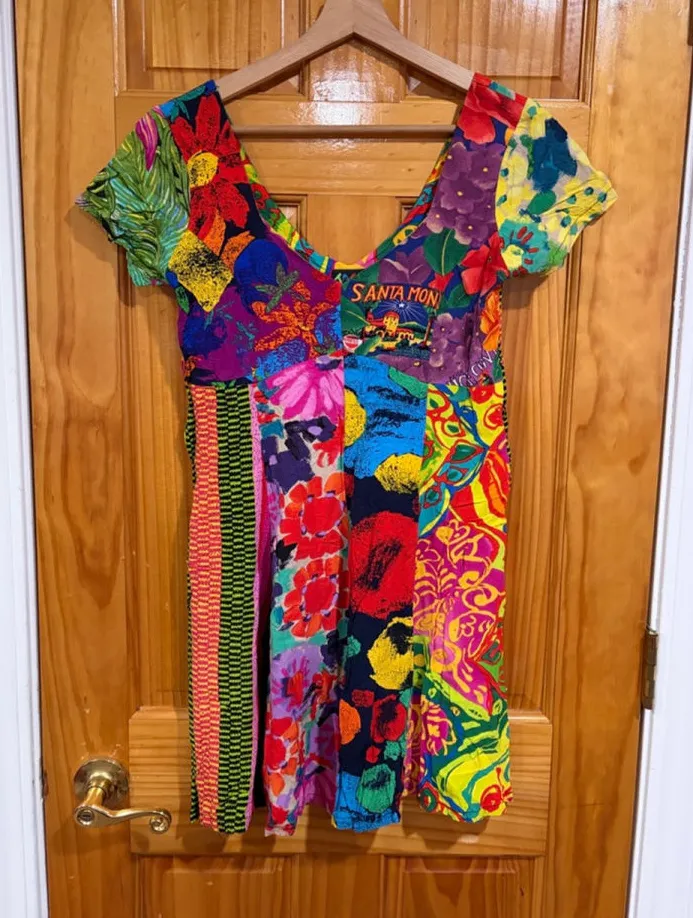 Incredible vintage James World patchwork mini dress featuring vibrant mixed prints, bold florals, and a collectible Santa Monica graphic panel. Fitted silhouette with a square neckline and short sleeves. A true 90s/Y2K statement piece with art-wear vibes. Details: Brand: James World Era: Vintage (90s) Gender: Women Size tag: Large Fit: Runs small — best fits approx Women’s Small to Medium (see measurements) Style: Patchwork mini dress Print: Floral, abstract, graphic Graphic: Santa Monica Sleeves: Short sleeve Length: Mini Material: Rayon (per tag) Condition: Good vintage condition with normal wear consistent with age. No major holes or stains noted. Notes: Measurements are approximate and shown in photos