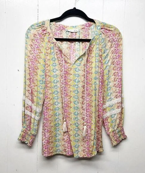 Jane & Delancey women's multicolor floral top. V-neck with tassels. Long sleeves. Smocked cuffs. Lac... Show more
