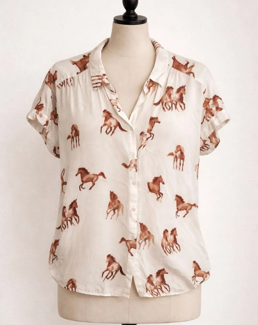⸻ • Brand: Jane + Delancey • Size: XL • Color: Ivory / cream with brown horse print • Material: 100% rayon • Made in: China • Style: Short sleeve button-up blouse • Features: • All-over horse print • Lightweight, flowy fabric • Collared neckline • Button front closure • Fit: Relaxed / drapey Western-inspired yet versatile—great for casual wear, layering, or styling with denim, boots, or skirts. ⸻ #HorsePrint #WesternStyle #WomensBlouse #BohoFashion #CasualChic ⸻ horse print blouse, western button up top, Jane Delancey blouse, rayon button shirt, women’s XL blouse, cowgirl style top, boho western shirt