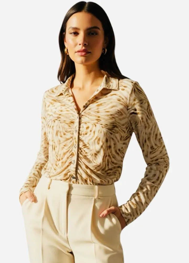 This elegant cream and brown top features a stylish sheer sleeves, ruched design, perfect for any oc... Show more