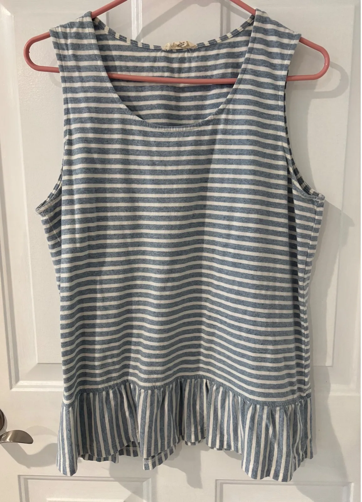 Effortless style radiates from this charming striped tank top. The classic blue and white stripes create a timeless look, while the playful ruffle hem adds a touch of feminine flair and a flattering silhouette. This sleeveless top is perfect for layering or wearing on its own for a relaxed yet put-together ensemble. Ideal for a casual day out, a weekend brunch, or a relaxed vacation. Type: Tank Department: Women Style: Tunic Material: 100% Cotton Neckline: Round Neck Sleeve Length: Sleeveless Sleeve Type: Casual Sleeve Pattern: Striped Accents: Ruffle Features: Stretch Fit: Regular Fabric Type: Knit Occasion: Casual Closure: Pullover Season: Summer, Spring Strap Type: Wide Strap Keywords: striped tank, ruffle hem, sleeveless top, casual wear, summer fashion, lightweight, feminine style, boat neck, knit top, breathable, everyday wear, vacation outfit