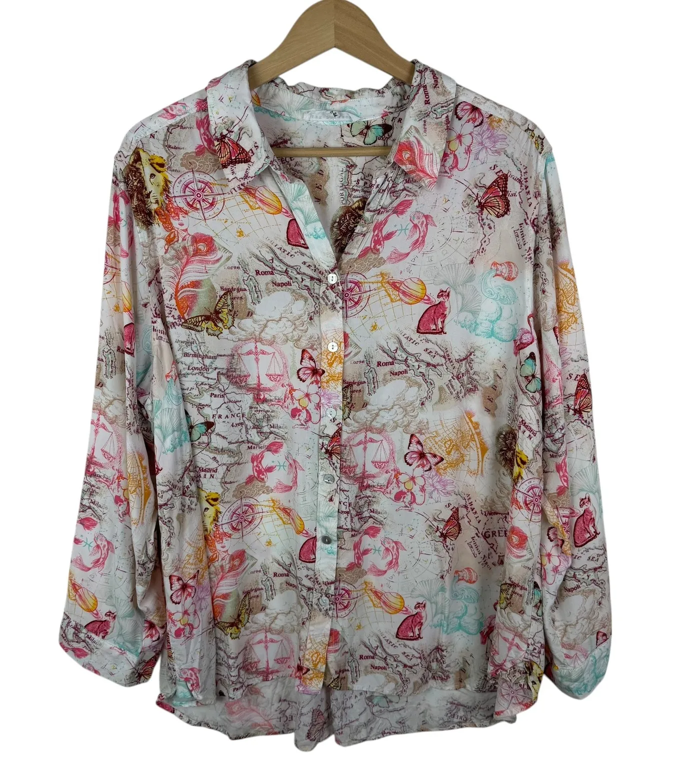 Jane Delancey 1X button-up shirt featuring a captivating map print with whimsical butterflies, lions... Show more
