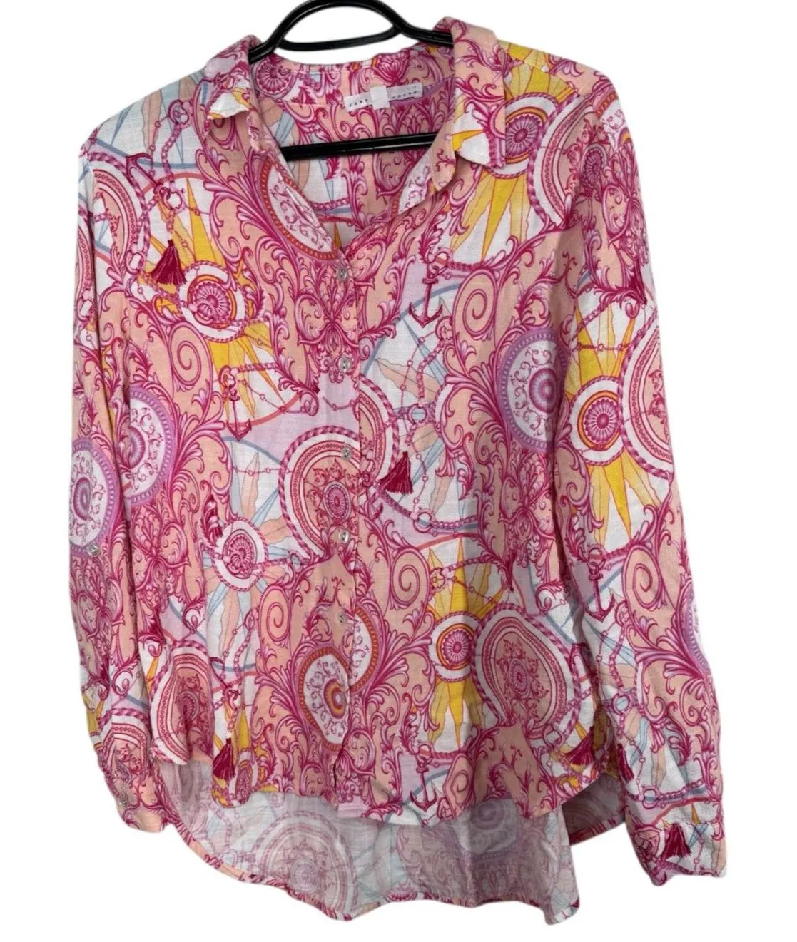 Condition: No rips, tears, stains or visible flaws. Please refer to photos to further evaluate condition. Description: - Button up - Chain, Anchor pattern - Super cute Offers welcome. Thank you! Tags: Bright Vacation Beachy Novelty Nautical Coastal Cruise
