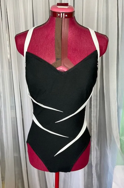 Women's size 8 wonderful black and white suit with flattering diagonal stripes. adjustable straps,... Show more