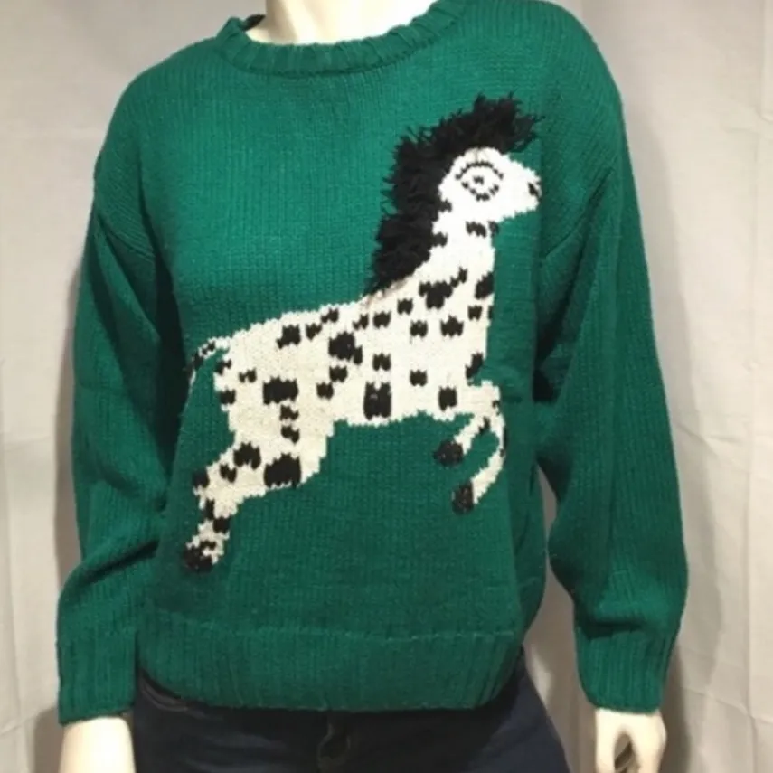 Jantzen emerald green knit sweater with a playful dalmatian horse graphic. This cozy sweater feature... Show more