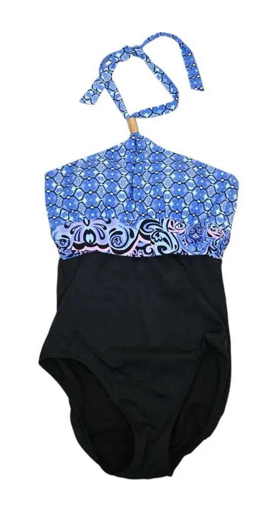 Very good preowned condition. No snags or pulls. Size 10. COLOR: Black, Blue Black, Blue, Purple and Pink Color Scheme Printed Top Printed Solid Bottom Lined Stretchy Comfortable Tummy Control Padded Bra (pads removable) High Cut Halter Gold Hardware Cleavage Opening Ties around neck Keyhole in front 78% nylon, 22% Lycra spandex LINING: 100% polyester Hand wash/line dry