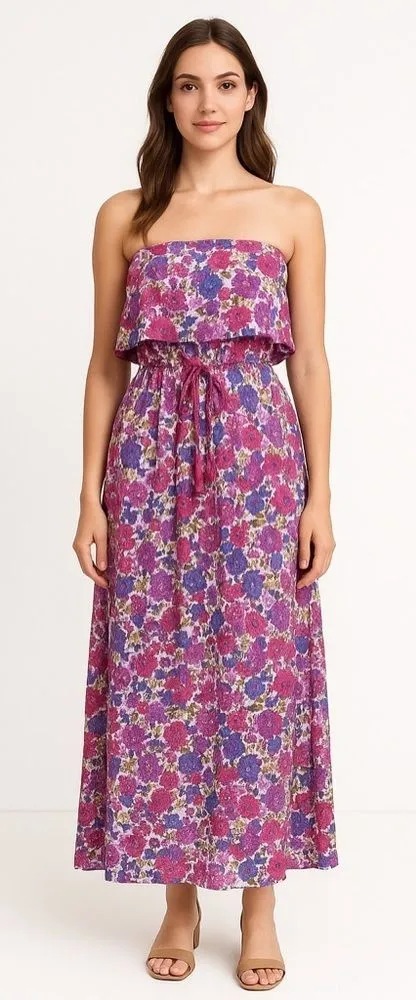 Japna women’s strapless floral maxi dress with ruffle top and tie waist. Pink and purple boho beach... Show more