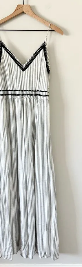 Size L Lined Smocked back Adjustable straps Stylish maxi dress with black and white stripes. Featu... Show more