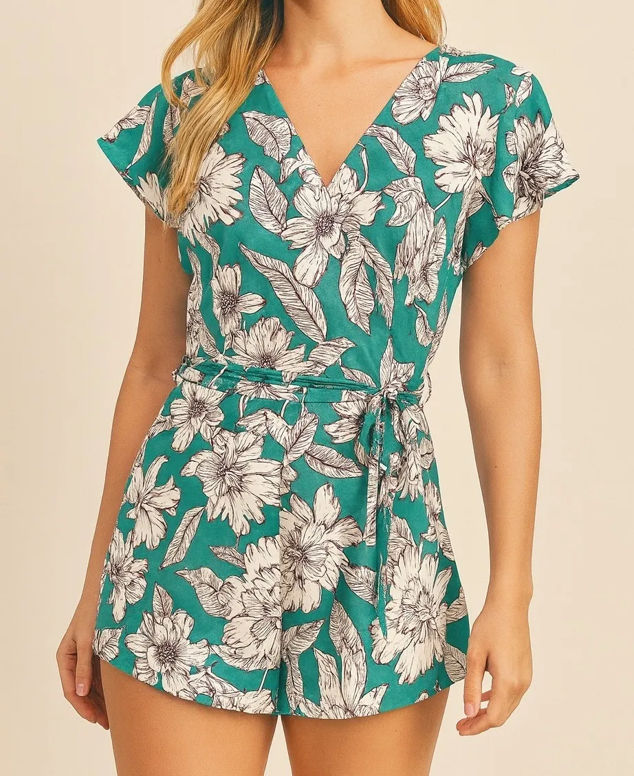 A teal floral print romper jumpsuit. Short sleeves and a V-neckline create a flattering silhouette,... Show more