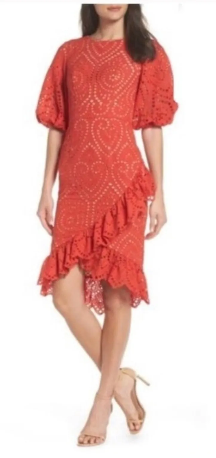 NWT Jarlo | Anika Eyelet Cocktail Dress in Orange Size 0 Beautiful cocktail dress with all over eyelet pattern, balloon sleeves. Super form fitting with asymmetrical front wrap bottom and tulip hem. Back Zipper closure and lined. Bust 14.5 inches Waist 12 inches Length longest peak 43 inches | Shortest 36 inches ::EE