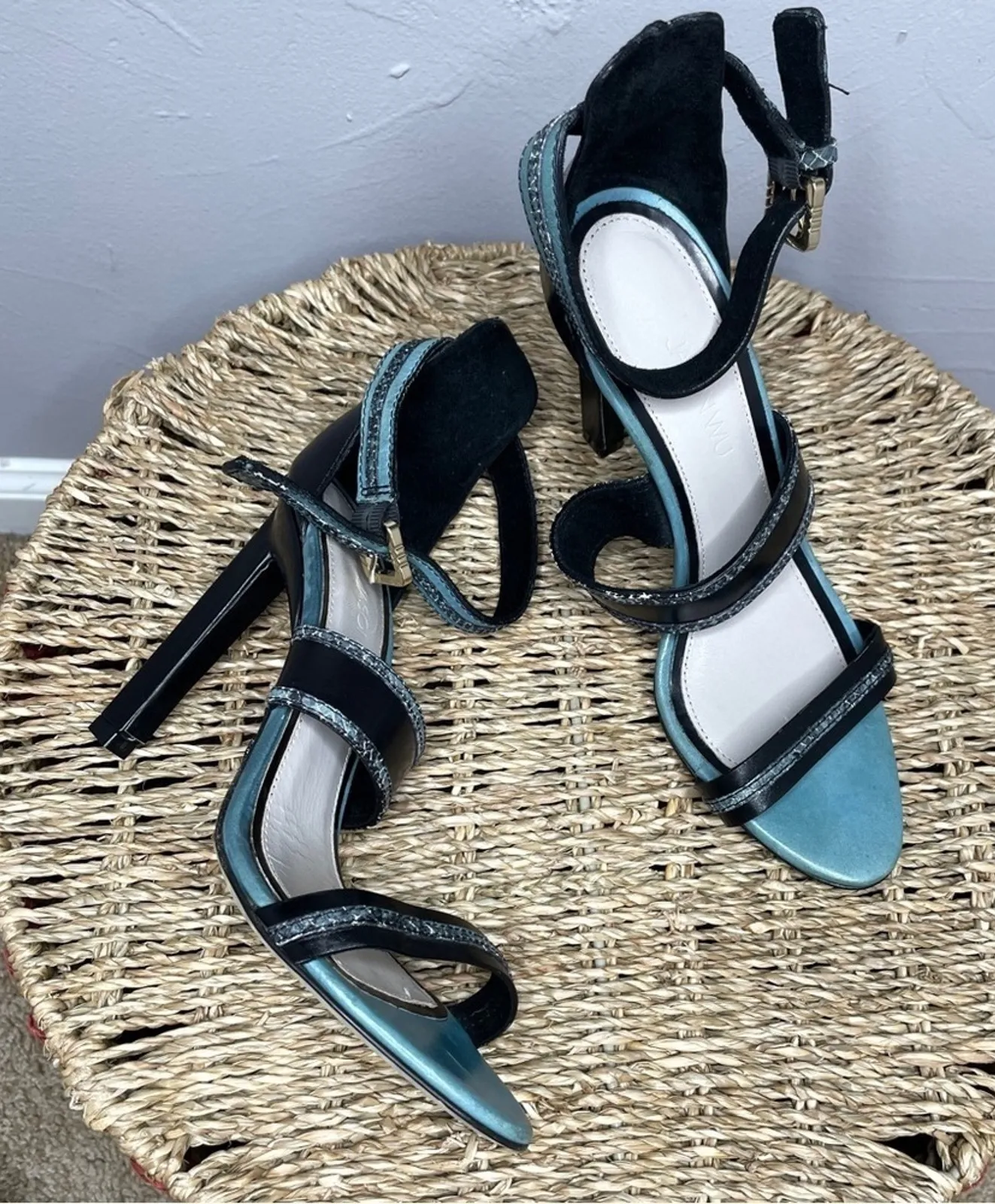 JASON WU Snakeskin Leather Strappy Heels Italy Party Elevated Size 36.5 (Roughly US 6, best for a more narrow foot) Made in Italy Black and teal 3 strap heels with snakeskin animal print detailing on straps, gold hardware at ankle strap, and thicker heel. Heel height: 4” Signs of minor wear on bottoms and is missing the band that holds the strap by gold buckle on right shoe. No other flaws. Special Occasion, Event, Holiday, Downtown, Chic, Baddie, Mob Wife, Glam, Date, Anniversary, Birthday, Girls Night Out, Going Out,