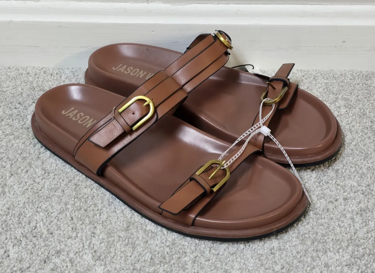 Elevate your warm-weather wardrobe with these stylish Jason Wu Women's Double Buckle Slide Sandals in a rich brown tone. Designed for both comfort and fashion, these sandals feature a modern minimalist look with gold-tone adjustable buckles and a cushioned footbed for everyday wear. Item Details: Brand: Jason Wu Style: Double Buckle Slide Sandals Color: Brown with gold-tone buckles Size: US 9 Condition: New with tags Material: Upper: Synthetic Lining: Synthetic Sole: Rubber Slip-on style with adjustable buckle straps Flat sole for comfortable all-day wear Made for casual or dressy summer looks Features: Dual strap design with functional buckles Subtle black edge detailing for added contrast Grooved rubber outsole for grip and durability Jason Wu branding on footbed Perfect for pairing with summer dresses, shorts, or casual jeans. These sandals deliver a sophisticated yet effortless look
