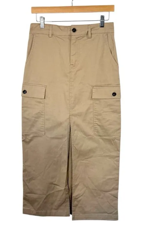 Brand: Jason Wu Color: Tan, khaki, brown Size: XS Condition: Excellent pre-loved condition! No major flaws! Features include: Zip and button closure Pockets Cargo pockets Front slit Midi length 60% cotton, 37% polyester, 3% spandex Measurements (approximate, taken laid flat) Waist: 15’’ Length: 35’’ All orders shipped same or next business day! Offers welcome :)