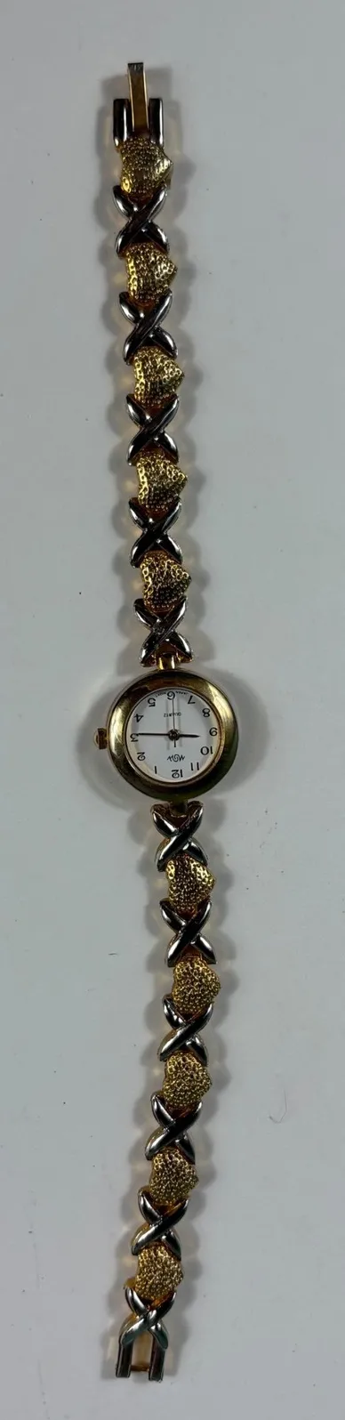 Elegant gold tone wristwatch featuring a white dial with black numerals and hands. The watch has a s... Show more