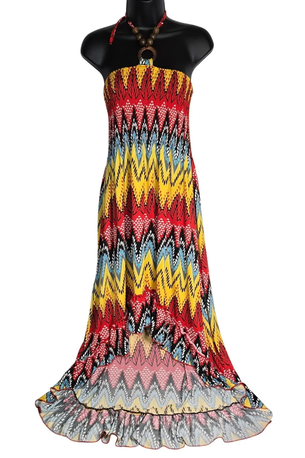 Size: M 98% Polyester, 2% Spandex Measurements are in photos. • Bust (smocked unstretched): 14 in In great pre-owned condition with no known flaws and minimal signs of wear. Keywords: halter dress, bohemian, tribal print, summer dress, resort wear, strapless, geometric, flowy, casual, travel, women's fashion, beach dress
