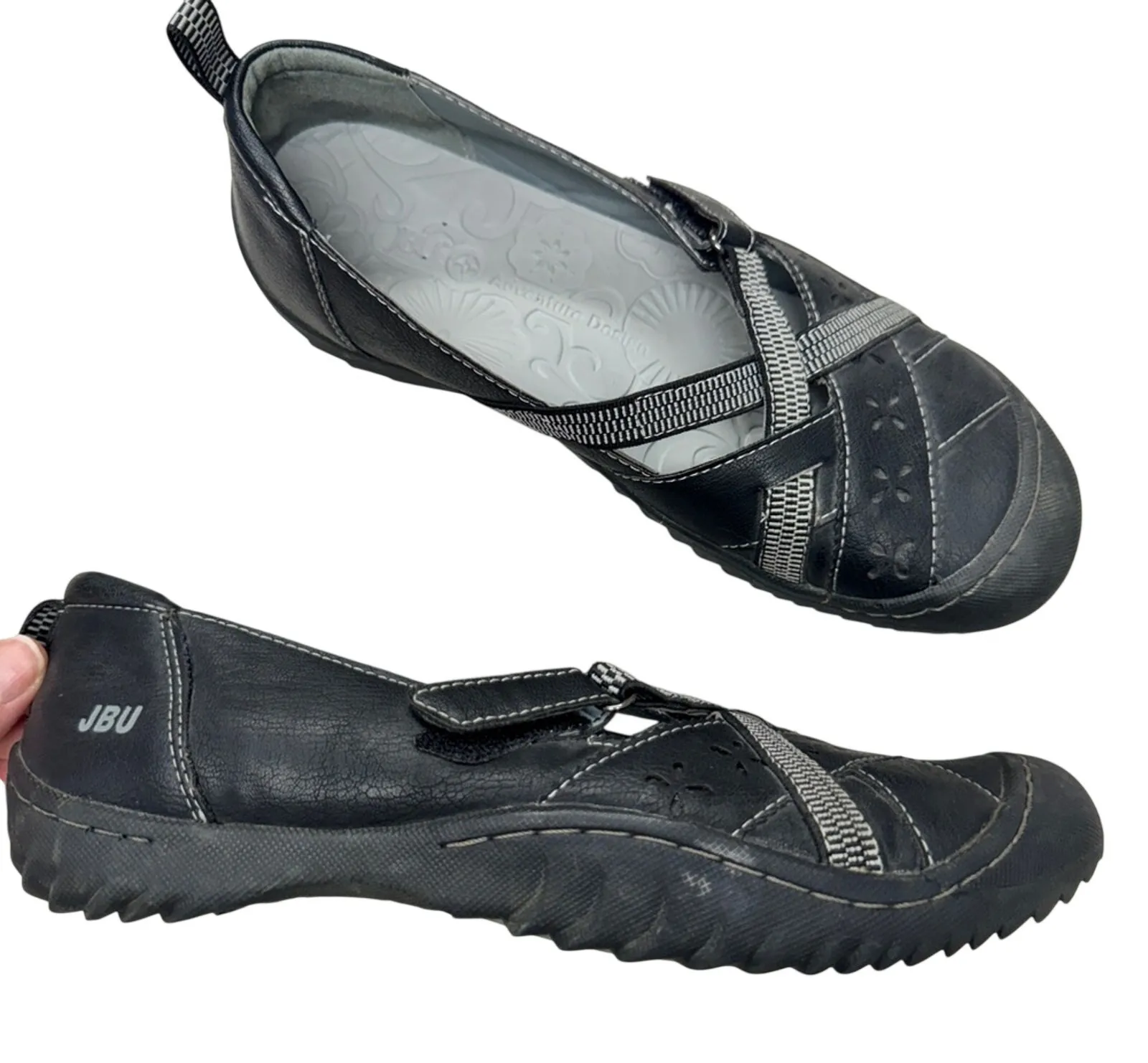 JBU Black Grey Leather Strappy Slip On Flats Womens 8.5 Comfort Shoes Casual - $30 - From Lisa