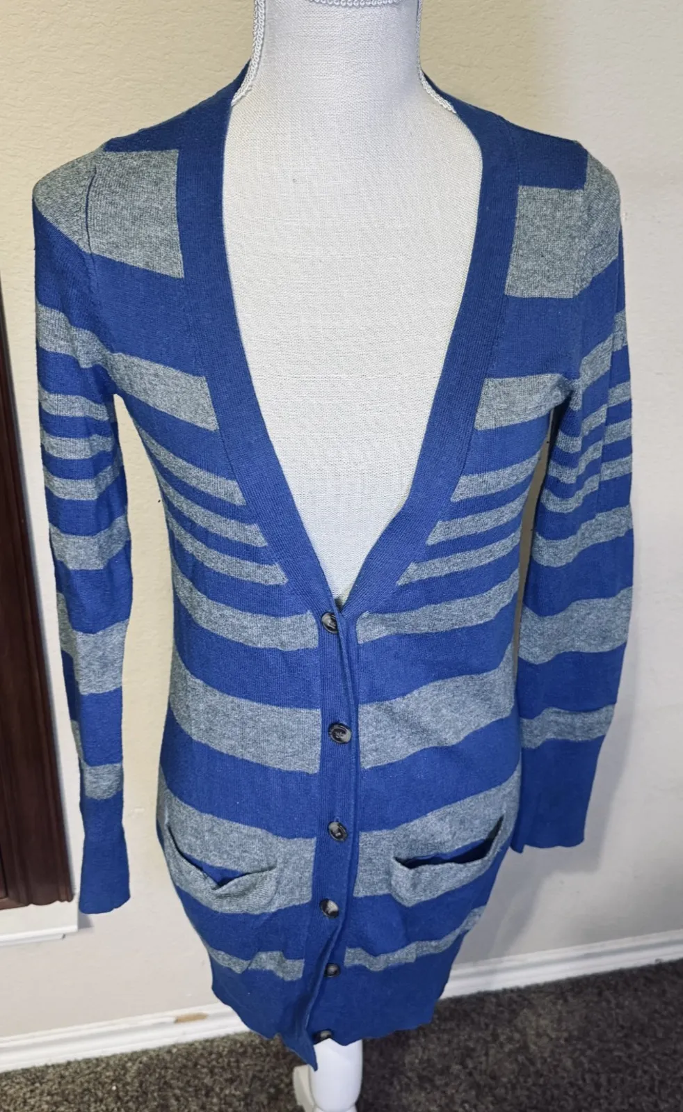 JCPenney Women’s Cardigan Sweater Size Small Cashmere Blend royal blue and gray striped gently used condition -- no holes or stains smokefree home button down with side pockets longer length 29" length, 19" pit to pit academia teacher university varsity Dallas Cowboys Duke Yale Georgetown