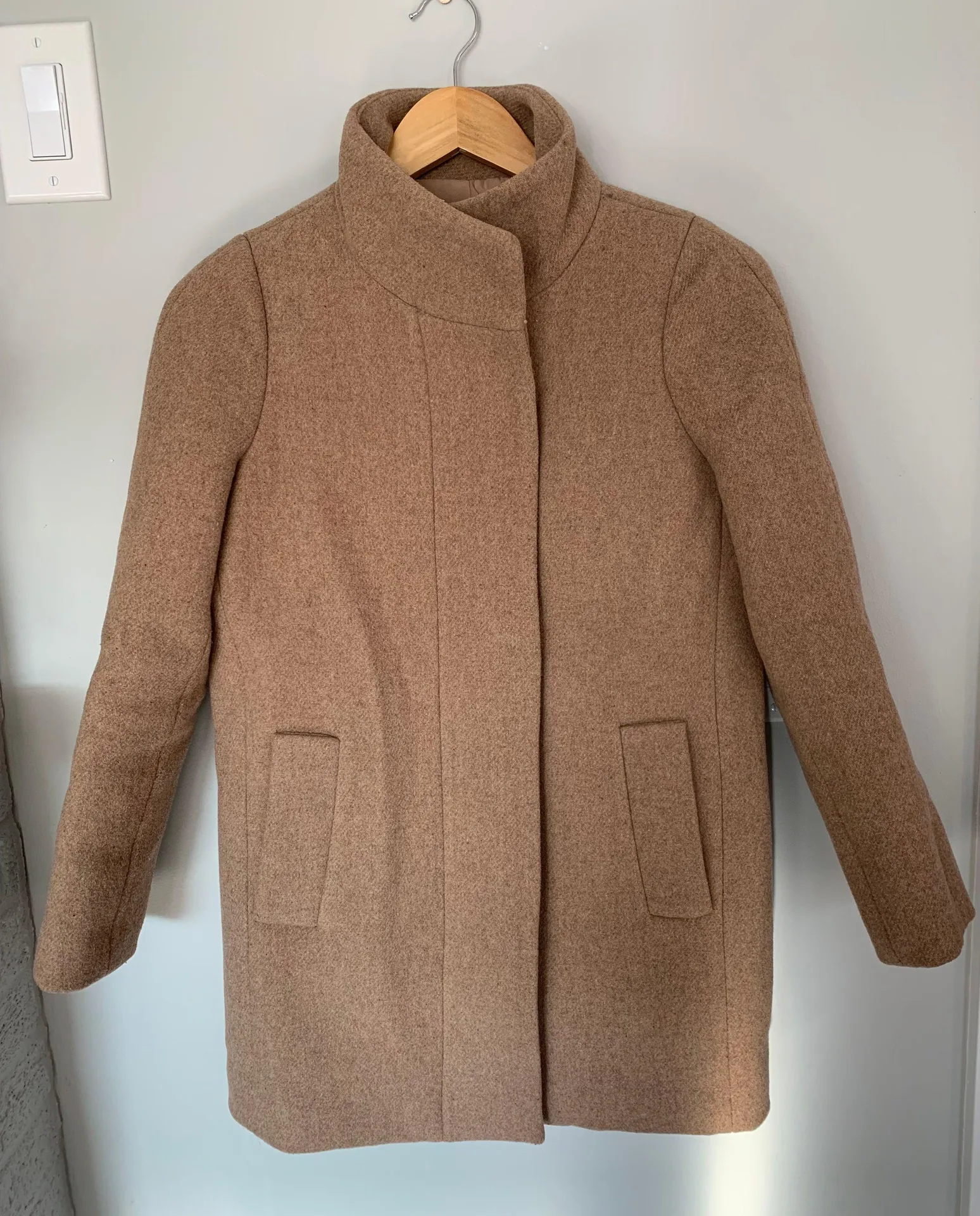 Jcrew city coat in tan. Gold detailing, wool/poly fabrics. FitS true to size and hits at the upper/m... Show more