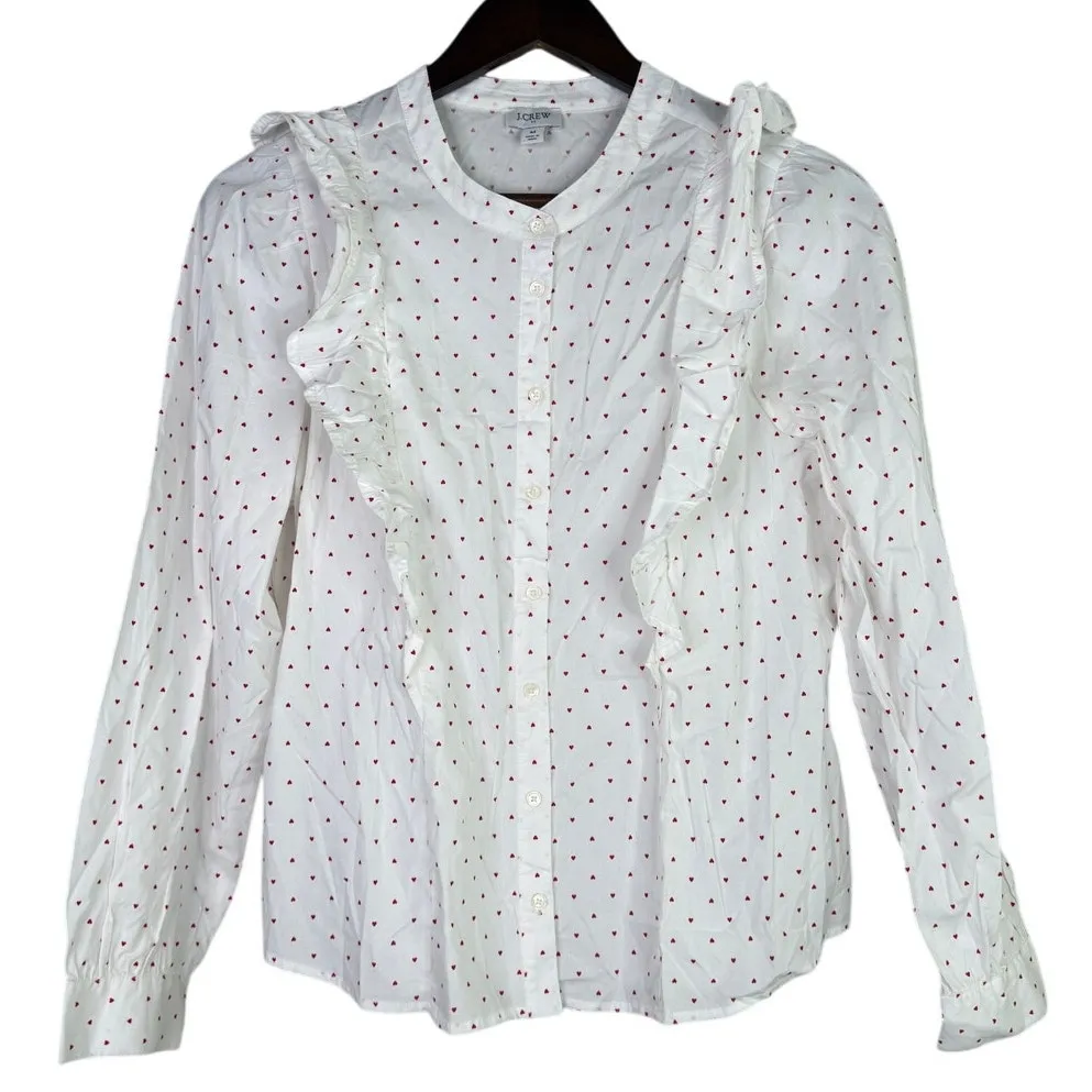 J. Crew Cotton Poplin Ruffle Heart Print Button Down Long Sleeve Shirt M White Red "The delightful... Show more