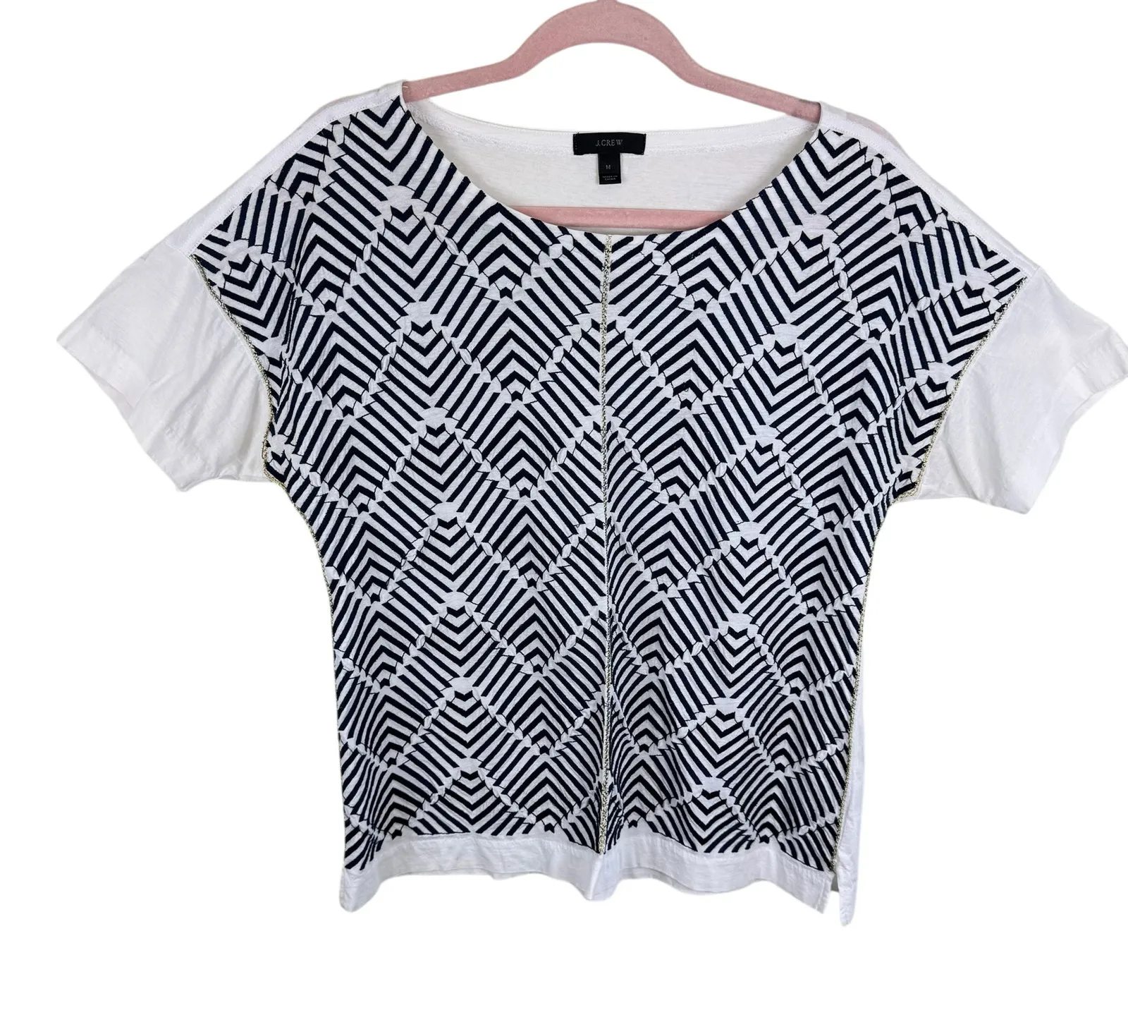 Excellent preowned condition. J.Crew White & Navy Striped Zig Zag Embroidered Short Sleeve T-Shirt.... Show more
