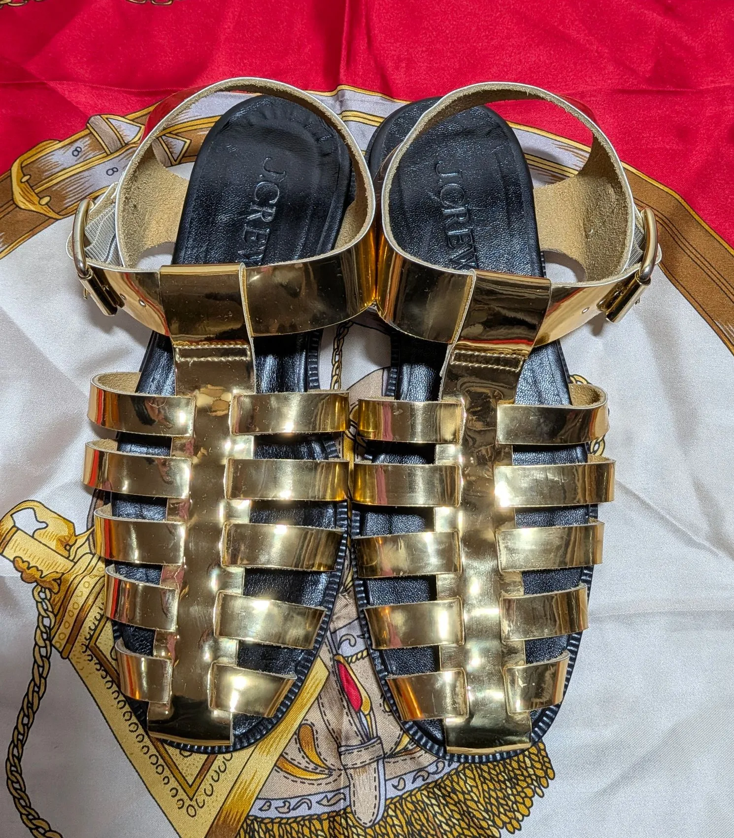 Has some scratches photo included Elegant sandals with a shimmering gold finish. Ideal for stylish... Show more