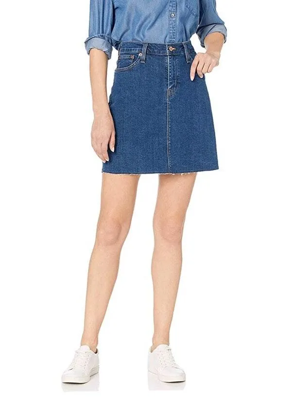 J Crew above knee denim skirt; never worn. Size 8, will fit a size 6 too. Fly with button-tab closu... Show more