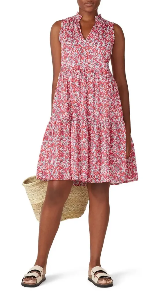 Brand: J.Crew (Made with Liberty Fabric) Item: Womens sleeveless dress Tag size: Small (S) Wiltshire print dress Color/Pattern: Red and pink Liberty floral print with navy leaves on a white base Design features: V-neck with subtle ruffle trim at neckline, gathered waist, tiered skirt, fit-and-flare silhouette Lining: Fully lined in white (as shown) bag90 4 modest , teacher , cute , spring , summer , flirty , vacation , brunch , girly